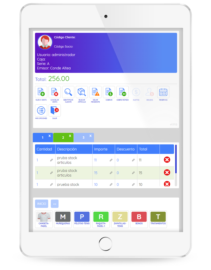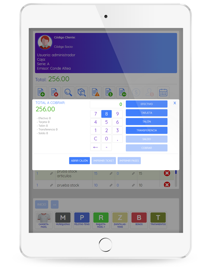 TPV táctil funciona tanto con terminales táctiles como a través de teclado y ratón. Desde las opciones de control podrás personalizar los artículos, categorías, tipos de cobros y tickets, etc.
