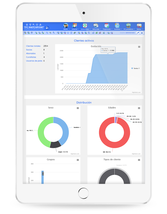 Mediante tpc-matchpoint podrá consultar las estadísticas de uso de pistas, las ventas y los ingresos. Conozca de un vistazo la situación real del club.